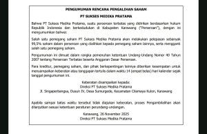 KARAWANG - Dengan ini diumumkan bahwa Tuan Indra S.T., S.H., M.H. beserta para pihak terkait (“Calon Pengambilalih”) bermaksud melaksanakan rencana Pengambilalihan atas PT Sukses Medika...