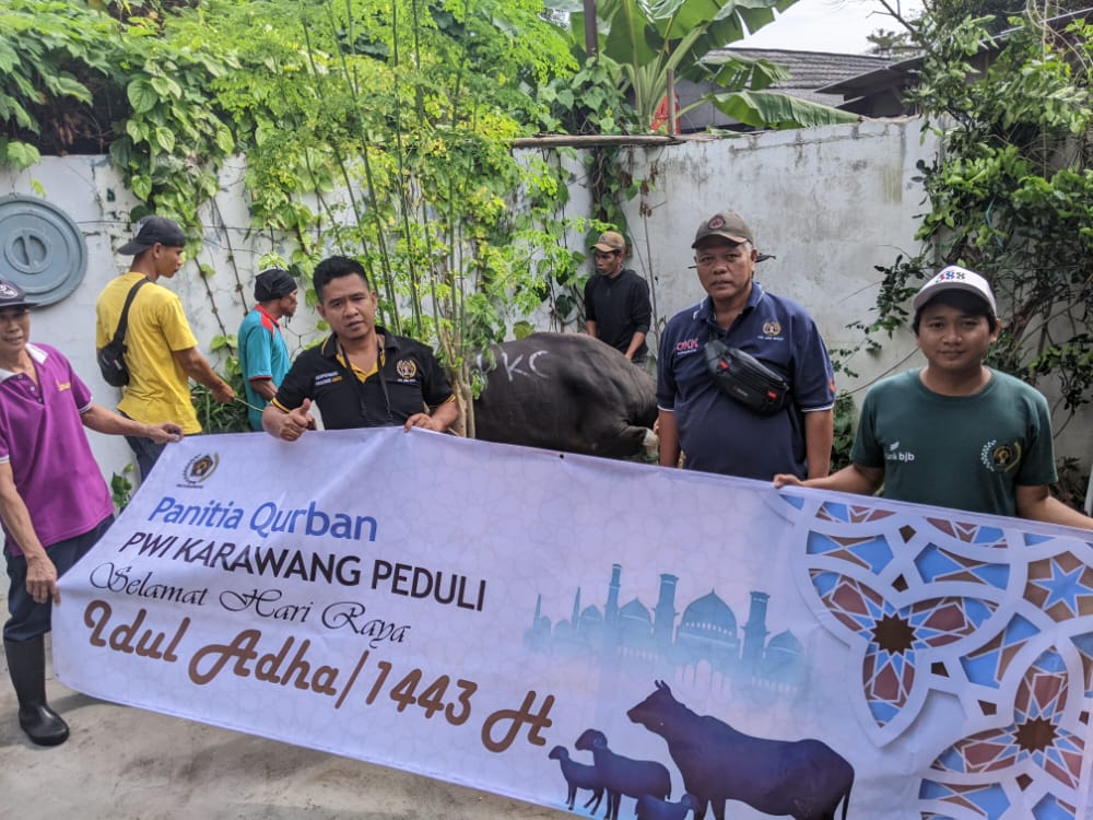 KARAWANG – Setiap hari raya idul adha, Persatuan Wartawan Indonesia (PWI) Karawang menyembelih seekor sapi kurban untuk dibagikan ke insan pers dan warga sekitar kantor PWI Jalan Malabar, Karangpawitan, Karawang Barat.