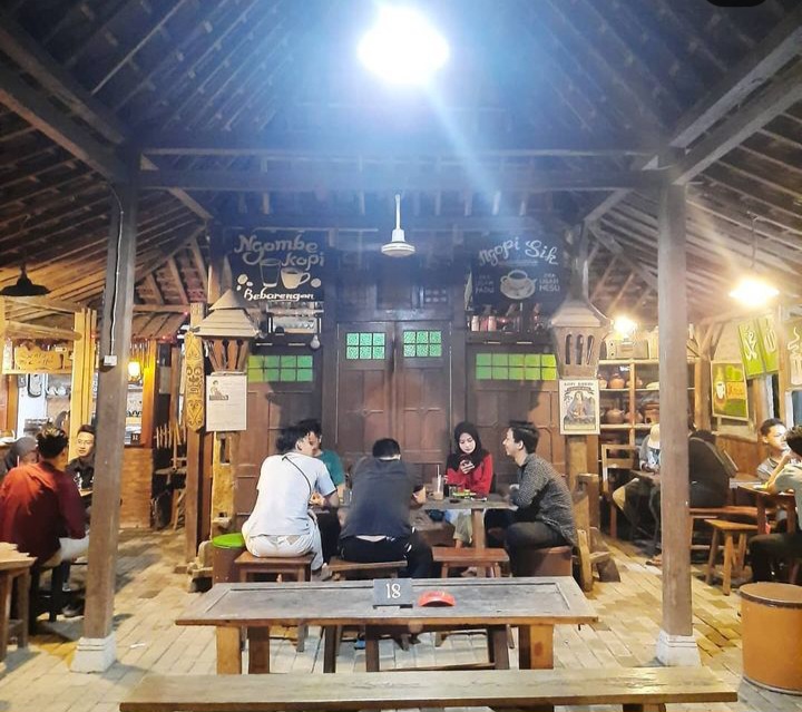 Kafe ini memiliki ciri khas unik yakni memiliki desain rumah tradisional masyarakat Jawa sehingga membuat Moms serasa sedang berada di rumah nenek.