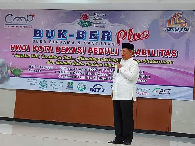 Bapak Siswadi dan Ibu Revita Alvi Ketua Umum HWDI menyerahkan secara simbolis, santunan penyandang disabilitas di Islamic Center Kota Bekasi Rabu (15/04/2022). Tausiyah disampaikan Bapak Ustadz H Azmi Daud.