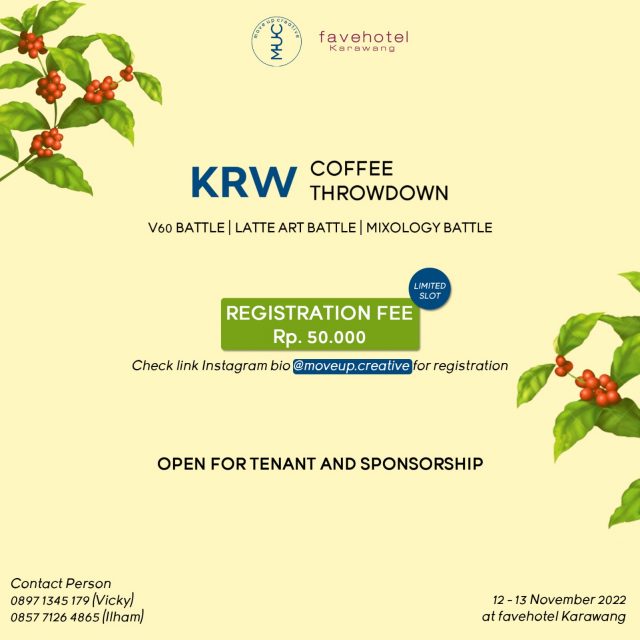 Yuk, datang ke event Karawang Coffee Throwdown dan rasakan sensasi kompetisi yang ketat dan memikat. Kami akan terus update info buat favers perihal jalannya kegiatan ini!
