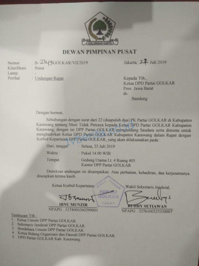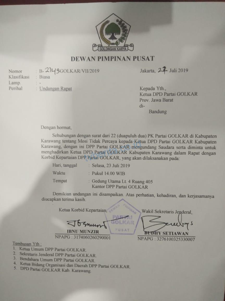 Surat undangan bernomor B-2148/Golkar/VII/2019 tersebut menjelaskan bahwa DPP Pusat mengundang Ketua DPD Propinsi Jawa Barat pada hari Selasa 23 Juli 2019 hari ini pukul 14 .00 WIB di Gedung Utama Lt. 4 ruang 405 kantor DPP Partai Golkar serta diminta turut menghadirkan Ketua DPD Partai Golkar Kabupaten Karawang.
