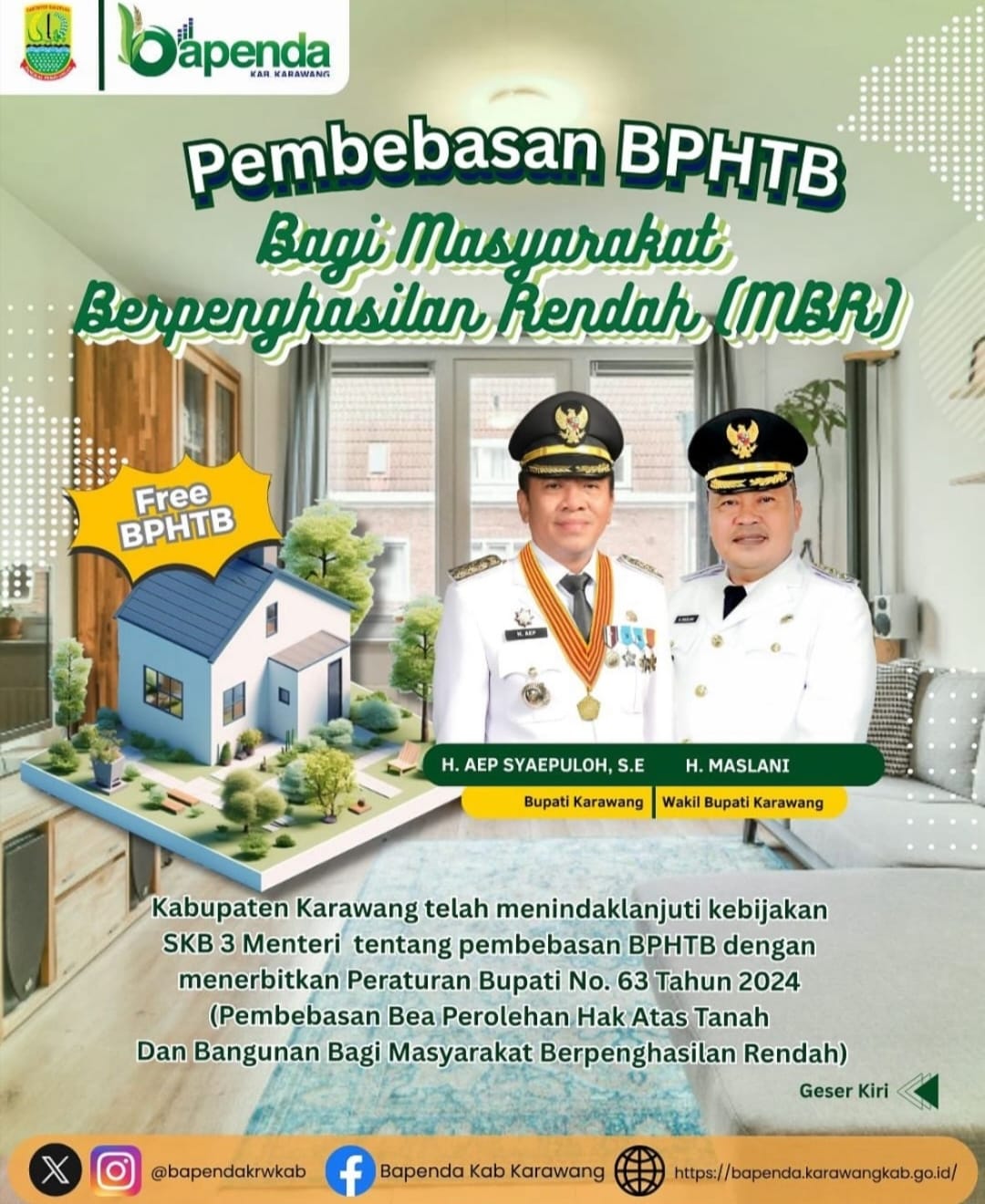 KARAWANG – Pemerintah Kabupaten Karawang resmi membebaskan Bea Perolehan Hak atas Tanah dan Bangunan (BPHTB) bagi Masyarakat Berpenghasilan Rendah (MBR) yang ingin memiliki rumah pertama. Kebijakan ini tertuang dalam Peraturan Bupati Karawang Nomor 63 Tahun 2024, sebagai tindak lanjut dari Surat Keputusan Bersama (SKB) 3 Menteri.
