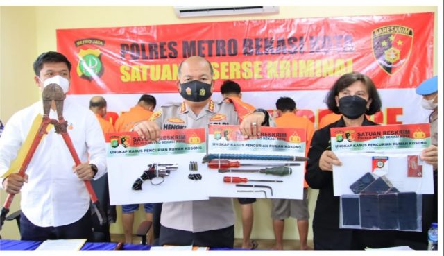 “Kita reskrim metro Bekasi kota mengungkap Sembilan laporan polisi yaiu kasus-kasus pencurian rumah ksoong yang dilakukan oleh kelompok, kita sudah mengamankan 6 tersangka dari 9 laporan yang ada,” ungkap Kapolres Metro Bekasi Kota Kombes Pol. Hengki , Rabu (19/01/22).