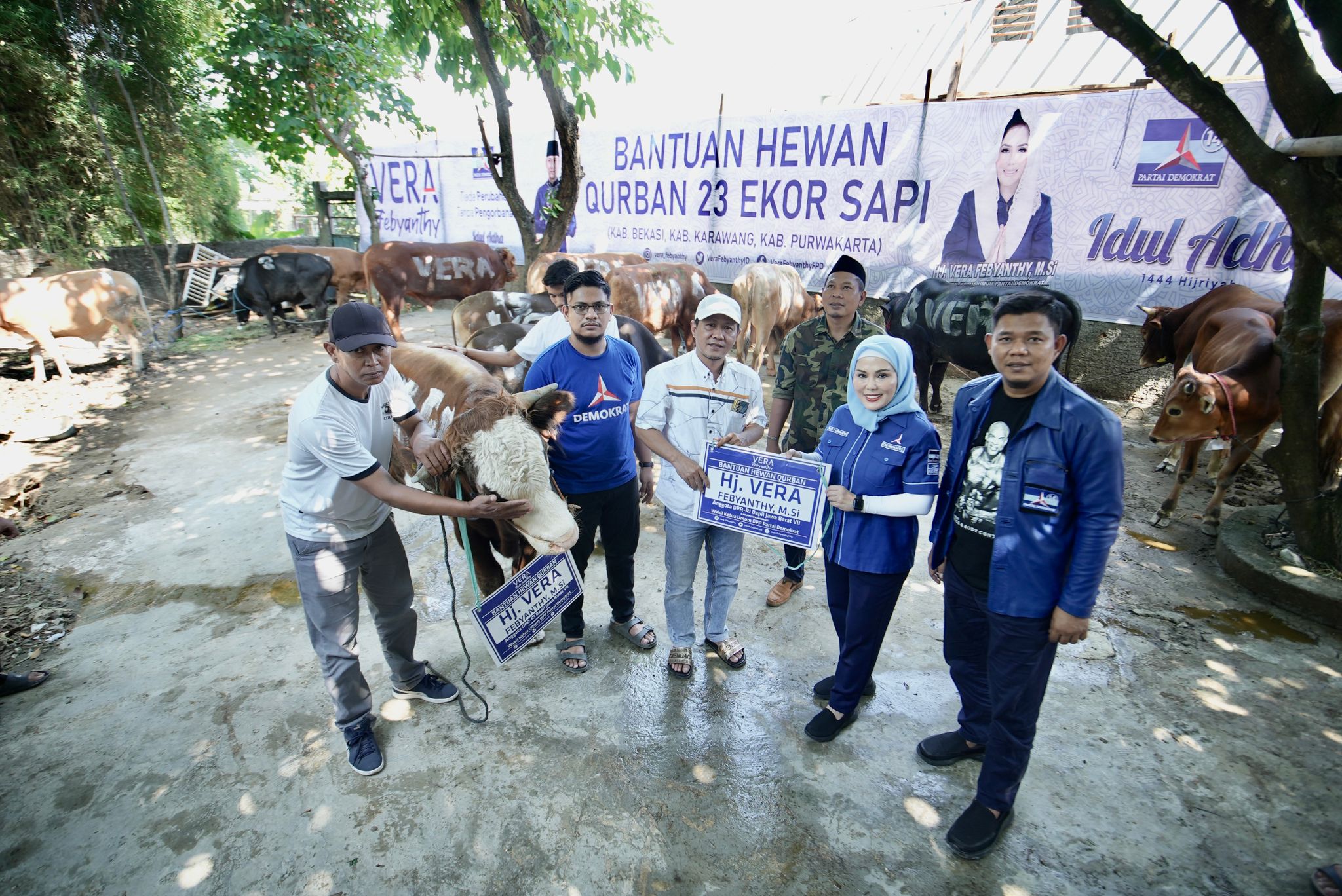 KARAWANG – Vera Febyanthy, anggota DPR RI Komisi XI dari Dapil Jabar 7 (Kabupaten Bekasi, Kabupaten Karawang, dan Kabupaten Purwakarta) sekaligus Wakil Ketua Umum DPP Partai Demokrat, membagikan 23 ekor sapi kurban di Hari Raya Idul Adha 1444 Hijriah.