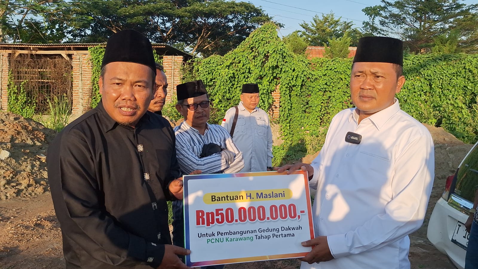 KARAWANG – Haji Maslani memberikan sumbangan tahap pertama sebesar Rp 50 juta untuk pembangunan Gedung Pengurus Cabang Nahdlatul Ulama (PCNU) di Tanjungpura, Karawang. Bantuan tersebut diterima langsung oleh Wakil Ketua PCNU Karawang, Sofyan Hadi, pada Senin (30/9).