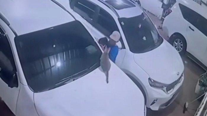 Satu pelaku langsung menuju mobil Fortuner yang terparkir di garasi dan mencoba melepaskan spion.
