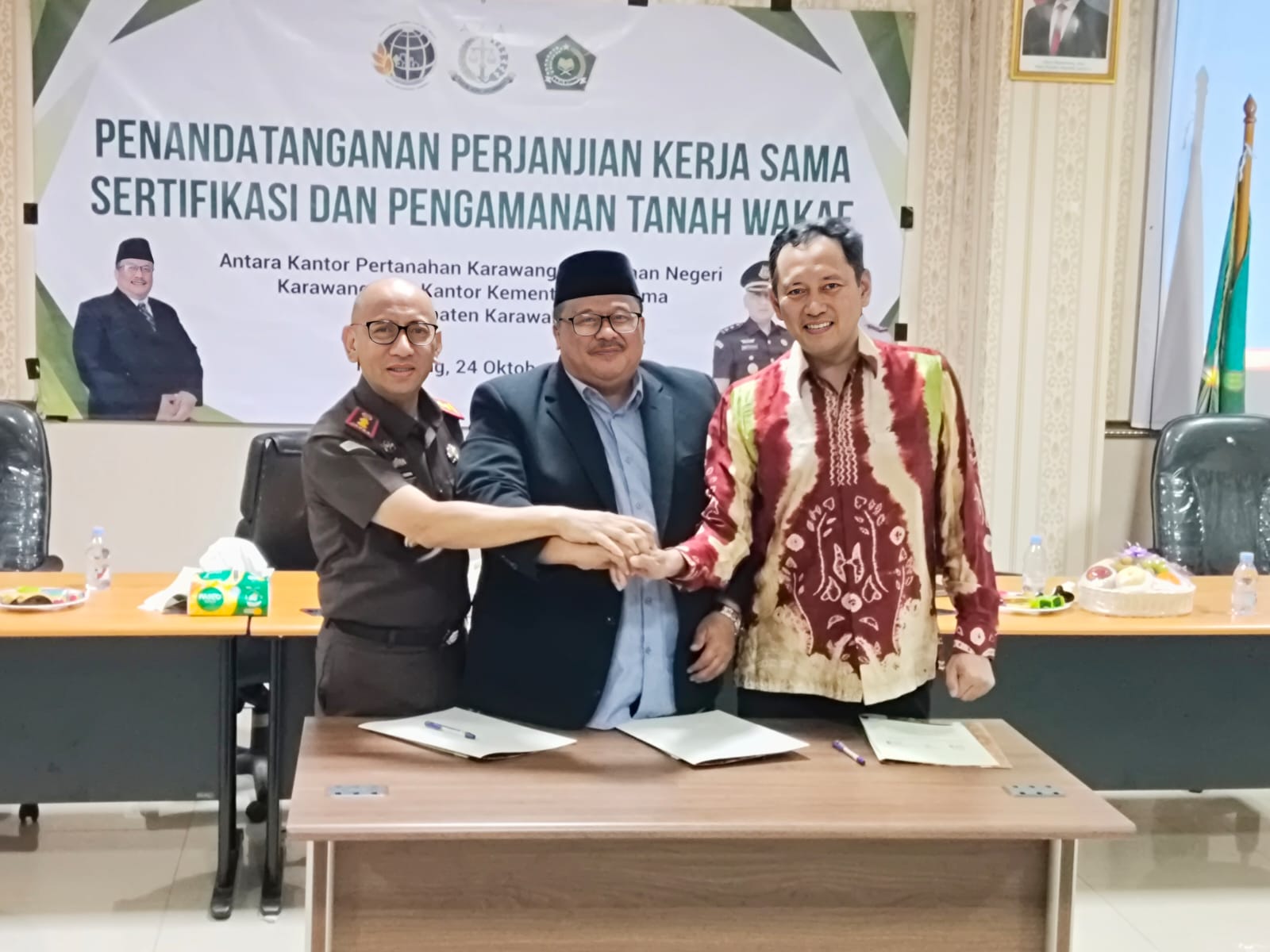 KARAWANG – Tiga lembaga di Kabupaten Karawang, yakni Kantor ATR/BPN, Kejaksaan Negeri, dan Kementerian Agama (Kemenag) menandatangani nota kesepahaman (MoU) terkait sertifikasi dan pengamanan tanah wakaf pada Jumat (24/10).