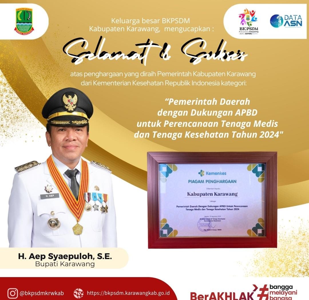 Penghargaan ini diberikan kepada Pemkab Karawang untuk kategori “Pemerintah Daerah dengan Dukungan APBD untuk Perencanaan Tenaga Medis dan Tenaga Kesehatan Tahun 2024.”