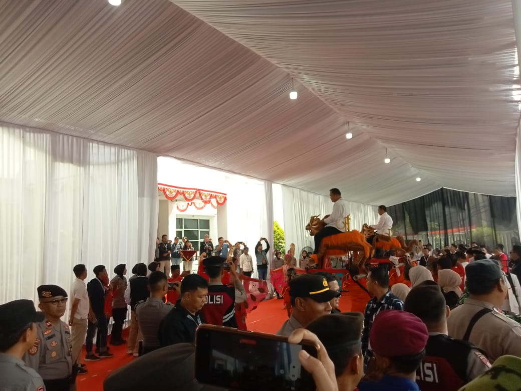 Saat tiba, Aep-Maslani disambut dan langsung digotong singa panggul untuk masuk menuju gedung KPU Karawang.