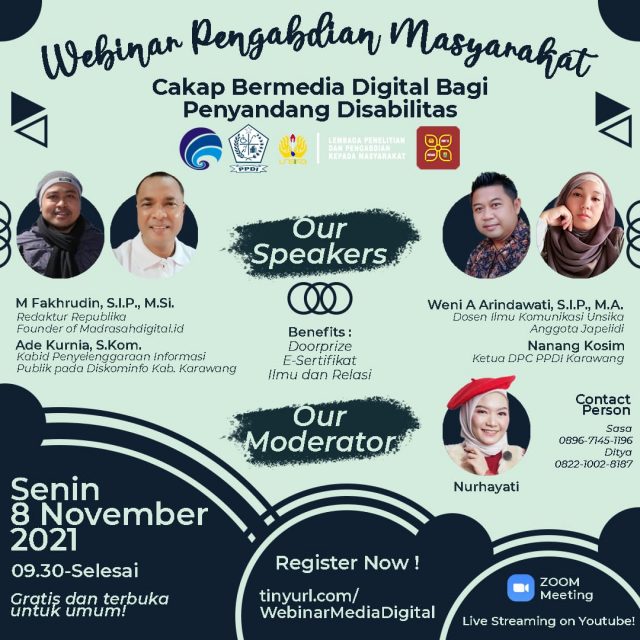 KARAWANG – Pengabdian masyarakat yang diimplementasikan dalam Kuliah Kerja Nyata (KKN) Universitas Singaperbangsa Karawang (UNSIKA) diselenggarakan secara virtual pada hari Senin, 8 November 2021. Dengan mengusung tema cakap bermedia digital bagi penyandang disabilitas.