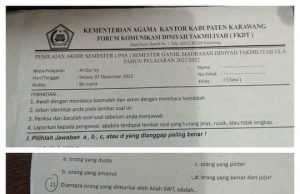 KARAWANG - Beredar kertas ujian pelajaran Al-Quran untuk kelas 1 Madrasah Diniyah Takmiliyah Awaliyah (MDTA) Karawang yang yang dinilai melecehkan Nahdlatul Ulama.
